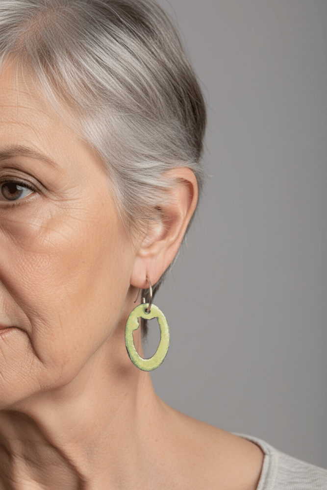 A pair of hand cut and formed abstract chain design, drop earrings. With silver sterling hoops. Painted with Vitreous Enamels in mint green and black, then kiln fired. These are inspired by the rusty chains you see along the coastal fishing quay walls.